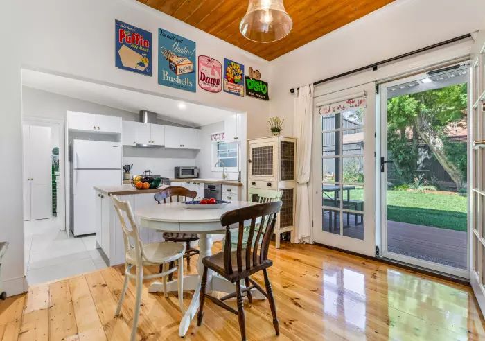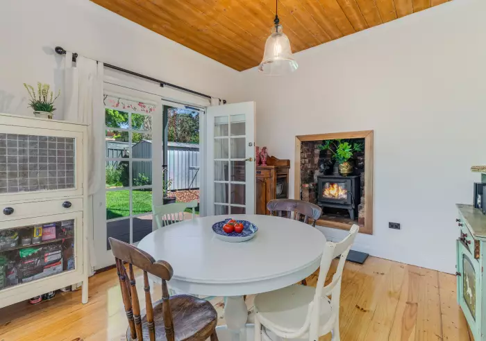 • Period features throughout, including dado boards, stained glass doors, over-mantle, picture rails, French doors, a feature red-brick fireplace with heater, steel picket fence, and Baltic pine ceilings.
