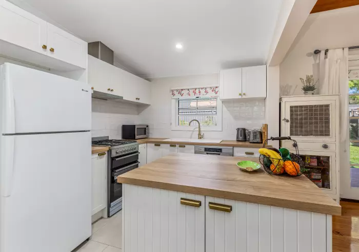• Open-plan kitchen and dining area with French doors leading to a new Spanline alfresco with decking, overlooking a beautifully low-maintenance garden.